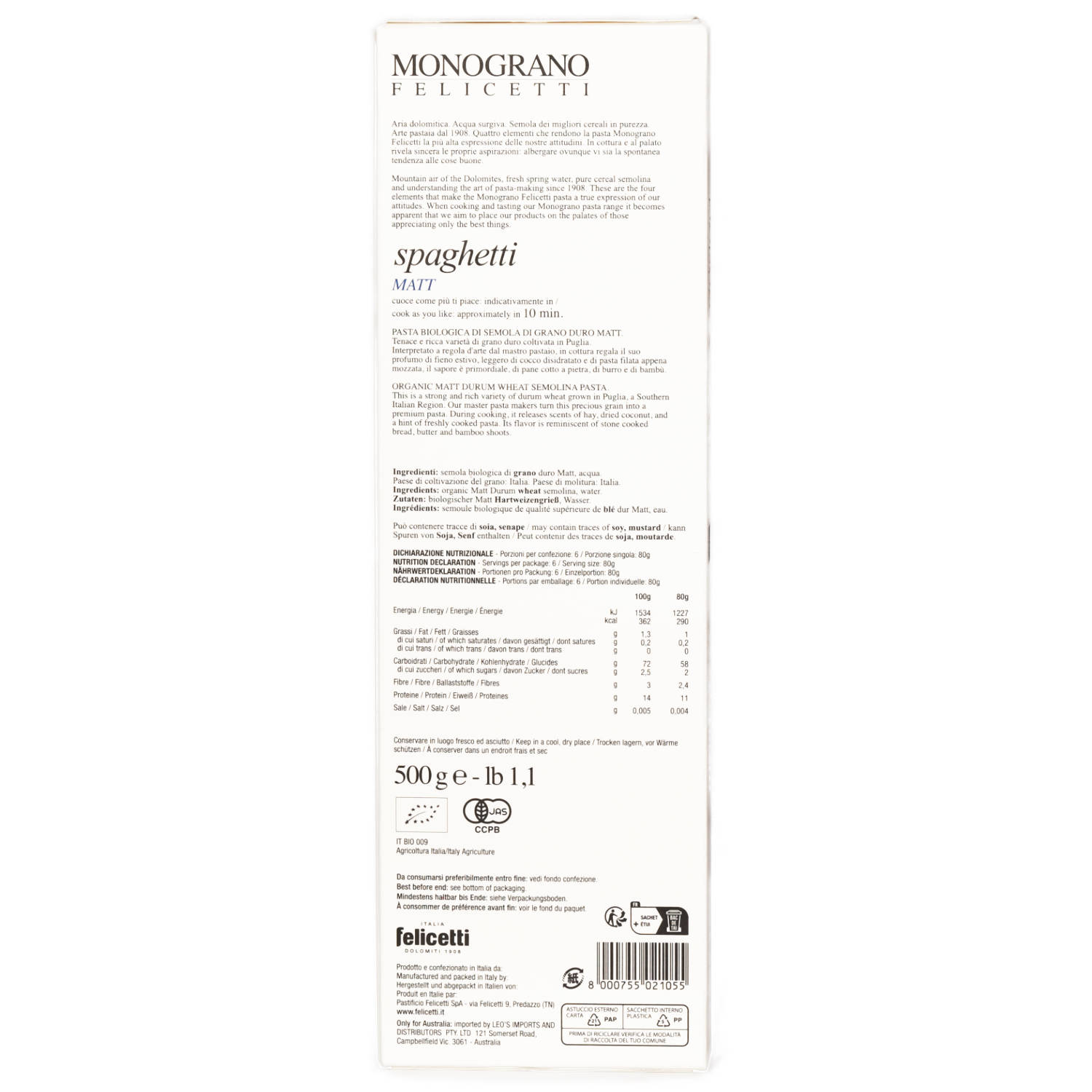 Die Spaghetti di Grano Duro von Felicetti werden aus hochwertigem Hartweizengrieß in den italienischen Dolomiten hergestellt und überzeugen durch ihre perfekte Bissfestigkeit und ihren vollen Geschmack. Dank der rauen Oberfläche nehmen sie Saucen besonders gut auf und entfalten so ein authentisches, italienisches Aroma. Ideal für traditionelle Pastagerichte, ob mit Tomatensauce, Pesto oder Aglio e Olio – diese Spaghetti bringen echte italienische Pastaqualität auf den Teller.